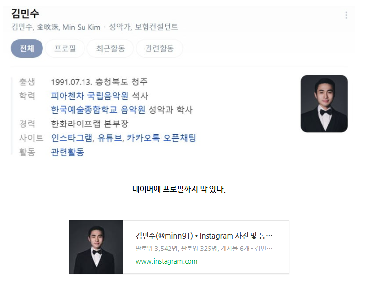 - 본명은 김민수이며 고향은 충청북도 청주 입니다.