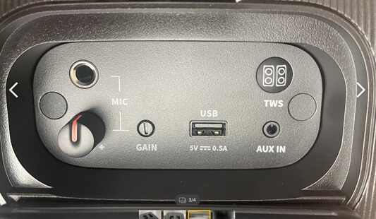 하단에 사진 참고하세요. 후면 입력부는 확대해서 찍었습니다. 마이크 단자 크기 가늠해보면 알겠지만 입력부 자체 크기가 전체 크기에 비해 작습니다. 살펴보면 마이크 입력단자와 볼륨 조절 다이얼이 있네요. usb 있고 이 단자로 다른 기기로 충전 가능하고 또는 여기에 usb 메모리 꼽아서 음악 인식 가능합니다. 오른쪽 위는 스테레오 옵션인 tws버튼이 있습니다. 지금 2대가 아니기에 해보진 않았지만 2대를 동기화할 때 사용하는 듯합니다. 그리고 밑은 aux in 단자가 있네요.